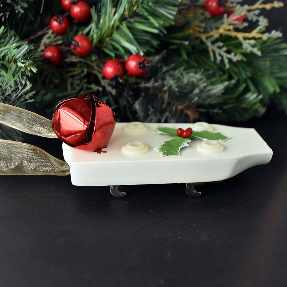 This ornament is crafted from a retired drum mallet, transformed into a unique piece. Sparkling festive beads and a red jingle bell add cheerful detail, while a shiny green ribbon completes the look. Each ornament helps support Band of Angels, bringing the gift of music to children in need.