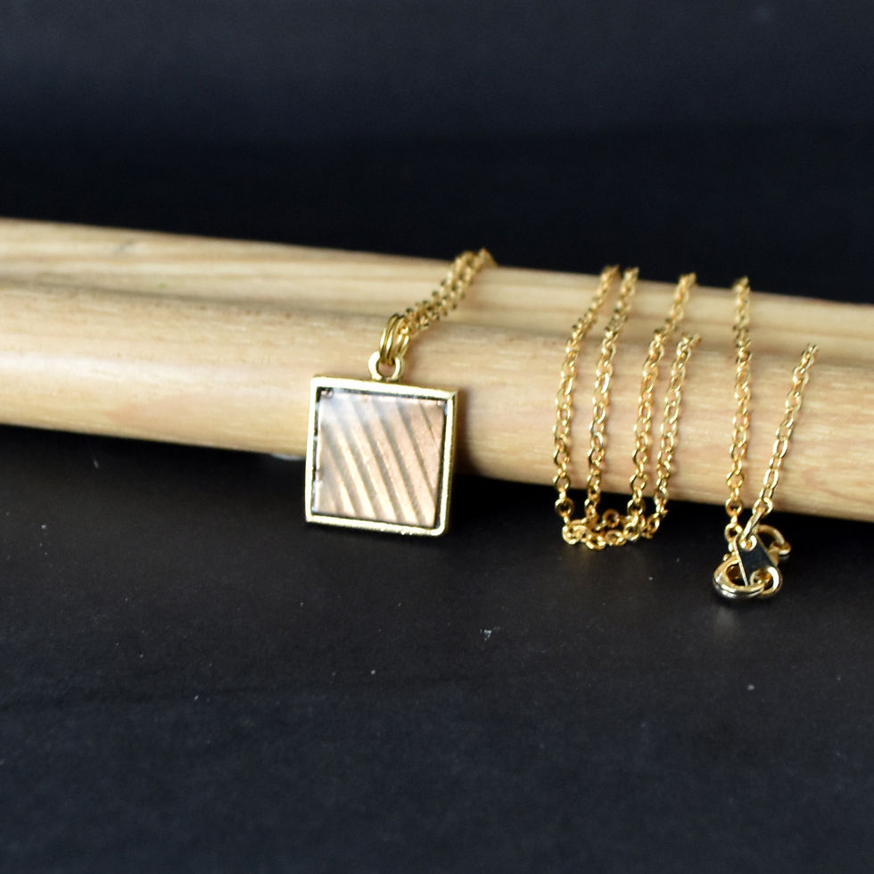 This one-of-a-kind necklace features a hand-cut piece of brass from a retired tuba bell, paired with a faceted navy blue bead that catches the light just right. The warm, worn metal and the deep sparkle of the bead create a striking contrast—music and mood in one simple piece.